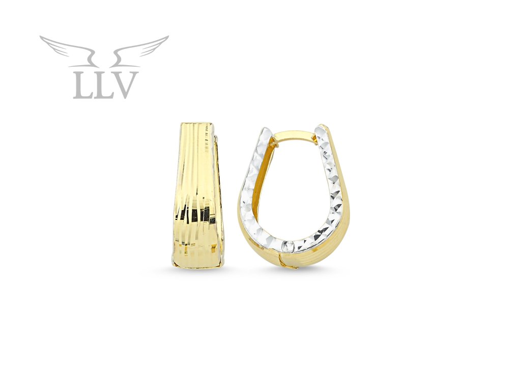 Moderný pár náušníc z kombinovaného 14kt zlata. Náušnice sú zdobené originálnym gravírovaním, pričom z boku sú náušnice zdobené bielym zlatom. Zapínanie je na zaklapnutie do drážky, ktoré je veľmi bezpečné a nebude Vám nijako prekážať. Vďaka svojmu minimalistickému prevedeniu sú náušnice veľmi elegantné a štýlové. Tento úchvatný pár náušníc určite poteší každú ženu aj slečnu a zaručene vykúzli úsmev na tvári.