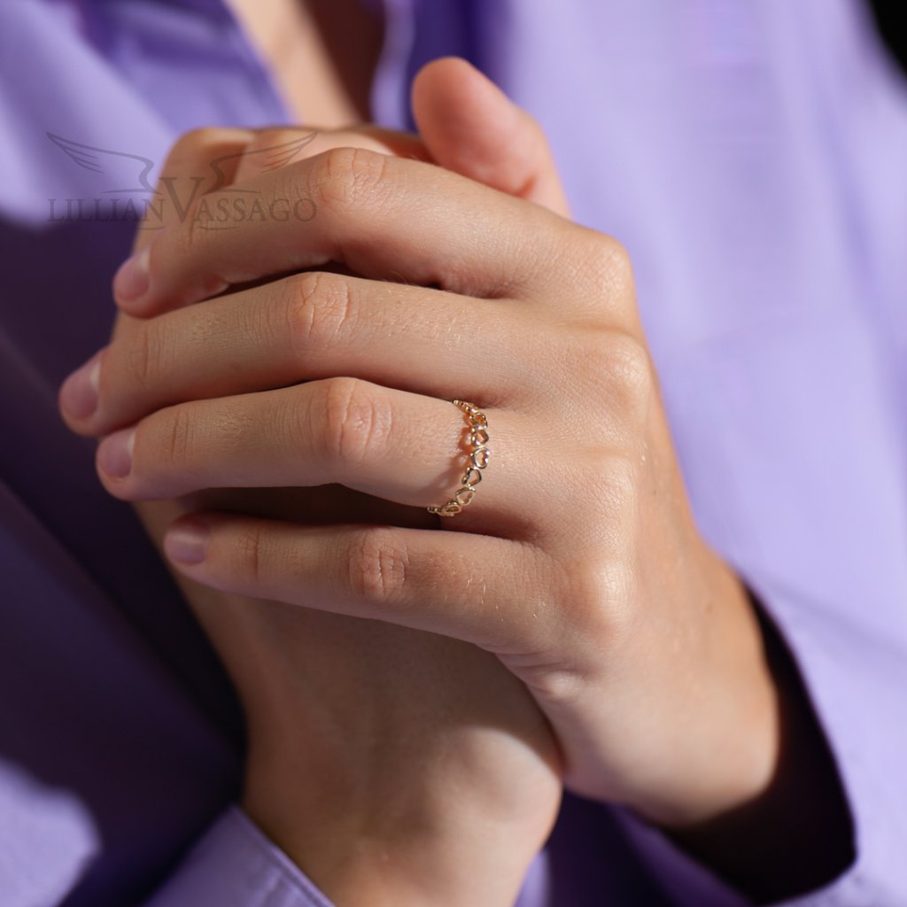 Romantický prstienok je vyrobený zo žltého 14kt zlata s lesklým povrchom. Celá obrúčka zlatého prsteňa je tvorená vzájomne prepojenými obrysmi srdiečok, ktoré pristanú dámske aj dievčenské ruky.