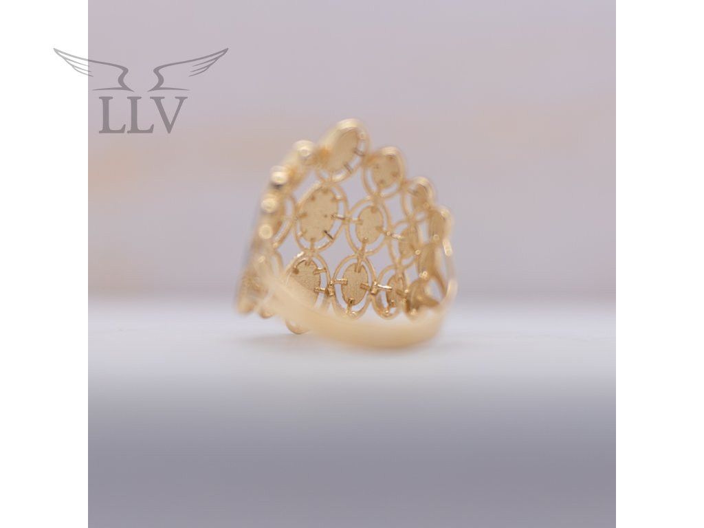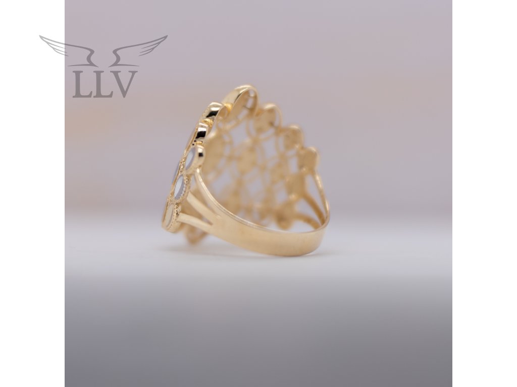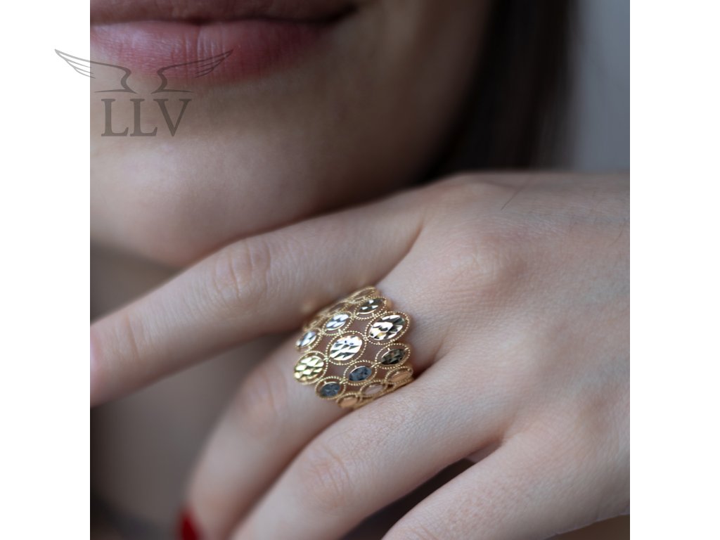 Zlatý prsteň s oválnymi prvkami z kombinovaného zlata a precíznym gravírovaním. Exkluzívny dámsky prsteň z kombinovaného žltého a bieleho zlata s nápaditým oválnym vzorom. Každý ovál je zdobený brilantným diamantovým gravírovaním, ktoré vytvára oslnivý lesk a luxusný vzhľad. Vďaka vzdušnému designu a lesklej povrchovej úprave pôsobí prsteň zároveň elegantne aj moderne. Ideálny pre ženy, ktoré chcú vyniknúť.