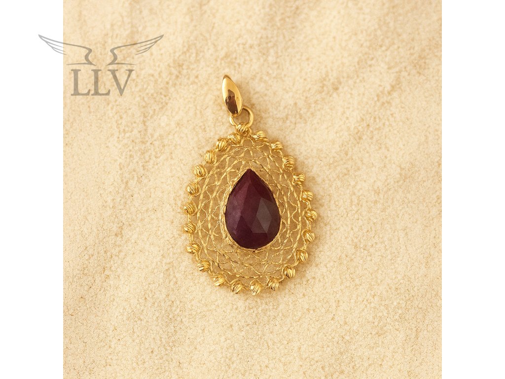 Rubín je zasadený do bohato zdobeného rámu z gravírovaného zlata kopírujúceho tvar kameňa, ktorý svojim krajkovým vzhľadom pôsobí naozaj luxusne. Reliéfne detaily po obvode dodávajú prívesku hĺbku a noblesu, čím z neho robia majstrovské dielo.