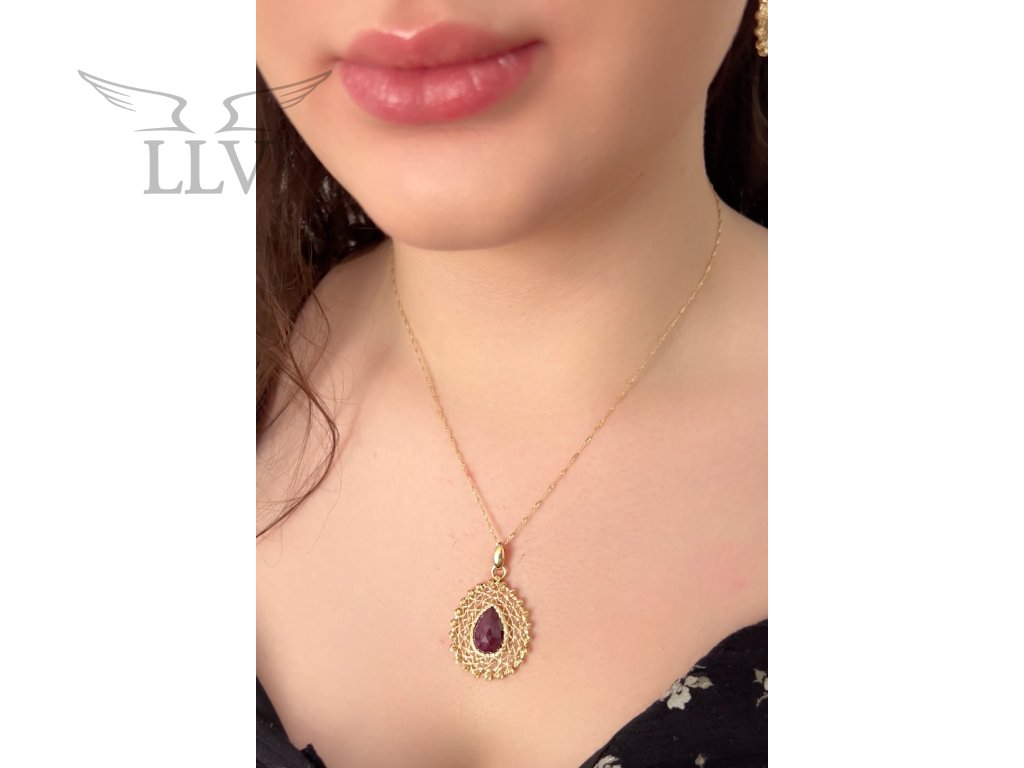 Exkluzívny prívesok v tvare kvapky zo žltého 14kt zlata vo vysokom lesku je šperkom, ktorý v sebe snúbi precízne spracované zlaté línie s vášňou prírodného drahokamu. Dominantou prívesku je výrazný prírodný rubín vybrúsený do tvaru kvapky, ktorého sýto červená farba symbolizuje lásku, silu a životnú energiu.
