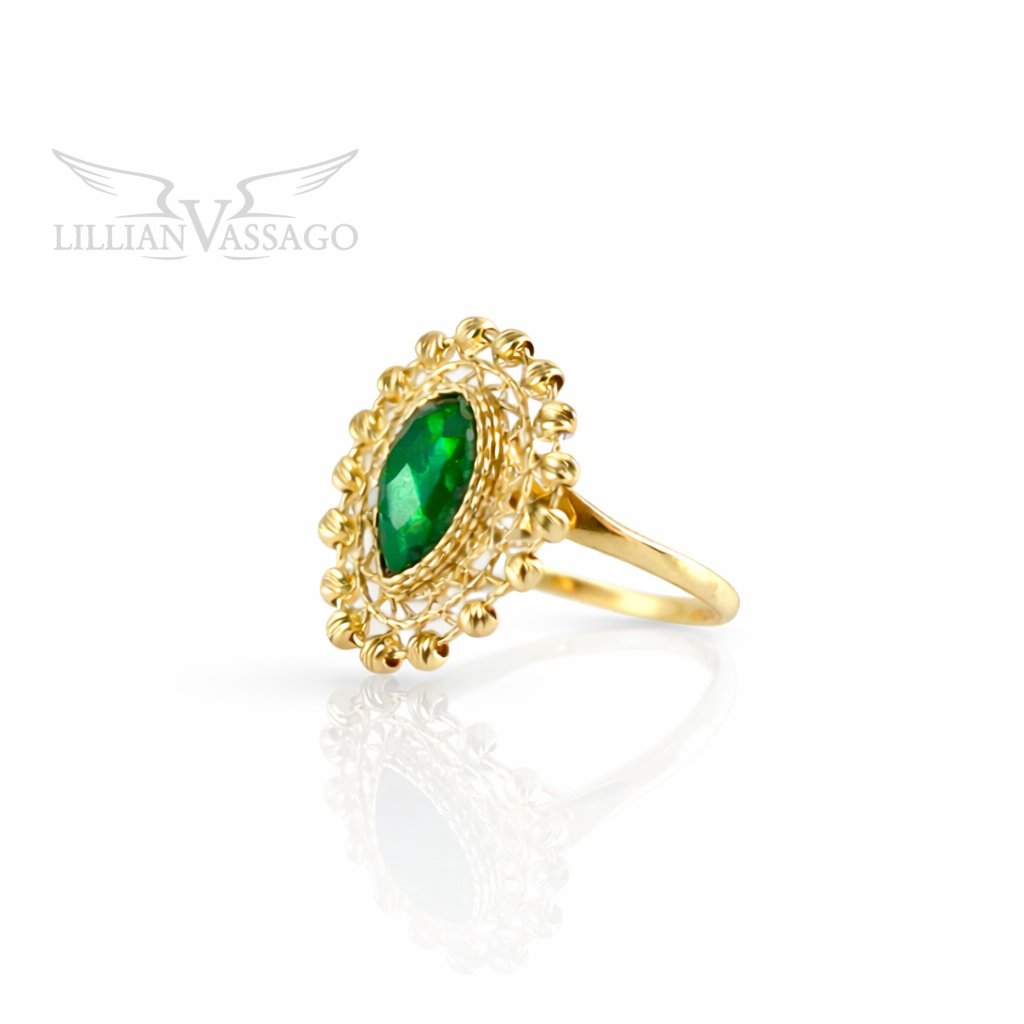 Exkluzívny zlatý prsteň zo žltého 14kt zlata v sebe spája jemnú zlatnícku prácu s krásou prírodného smaragdu. Dominantou šperku je výrazný smaragd v tvare kvapky, ktorého sýto zelený odtieň pôsobí sviežo, harmonicky a priťahuje pozornosť svojou prirodzenou hĺbkou. Kameň je zasadený do bohato zdobeného rámu z gravírovaného zlata, ktorý pripomína krajkový vzor. Jemné reliéfne detaily po obvode umocňujú noblesný charakter šperku a dodávajú mu pôvab starobylej elegancie.