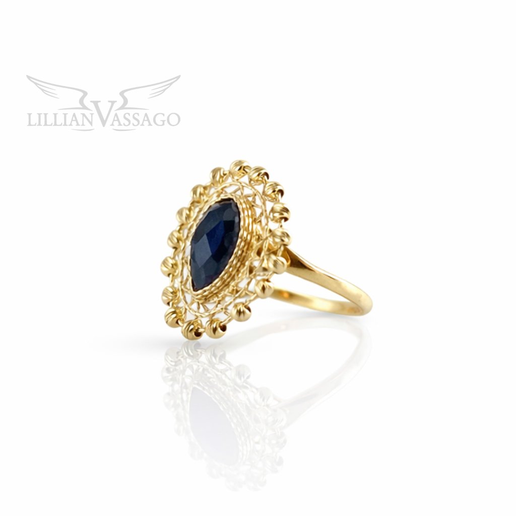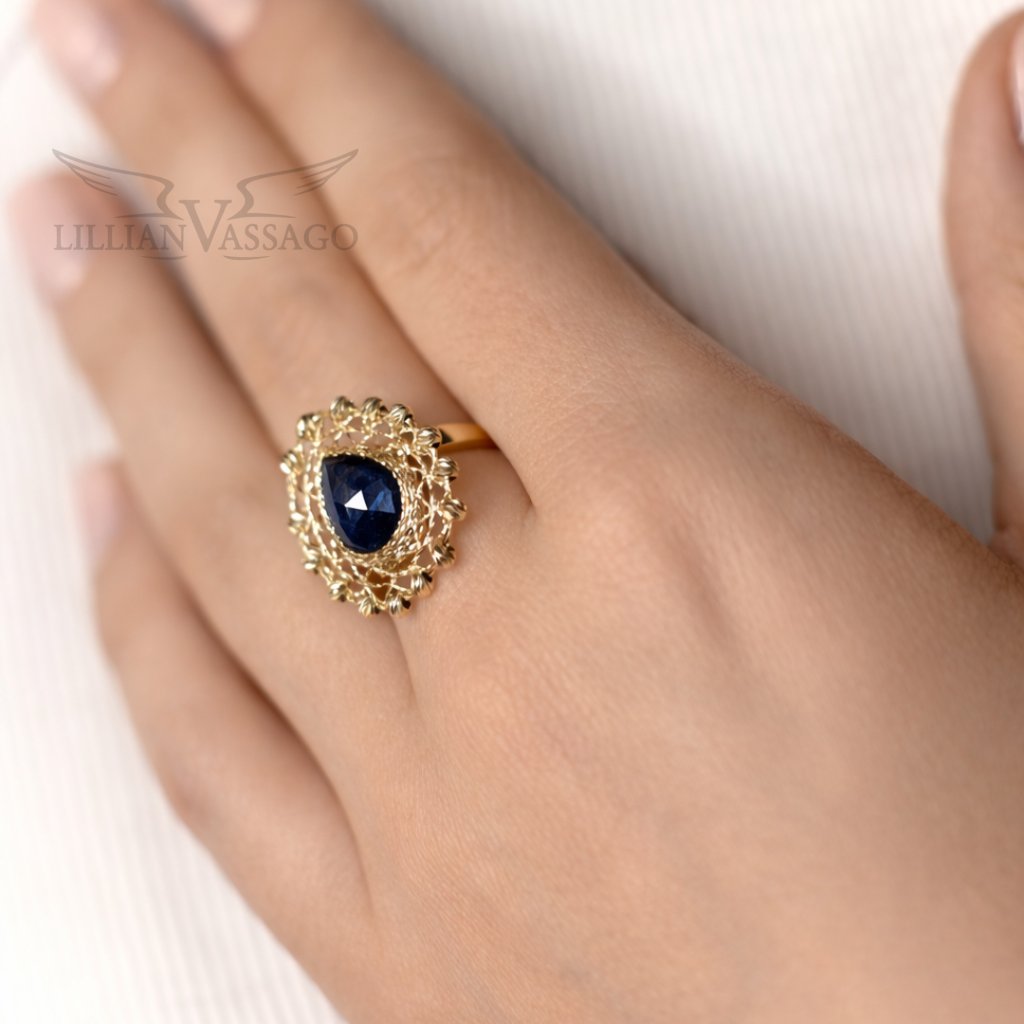 Zafír je zasadený do bohato zdobeného zlatého rámu s gravírovanými detailmi a plastickými prvkami, ktoré vytvárajú dojem jemnej čipky. Táto prepracovaná kompozícia dodáva prsteňa nielen na luxuse, ale aj na jedinečnosti - pôsobí ako umelecké dielo.