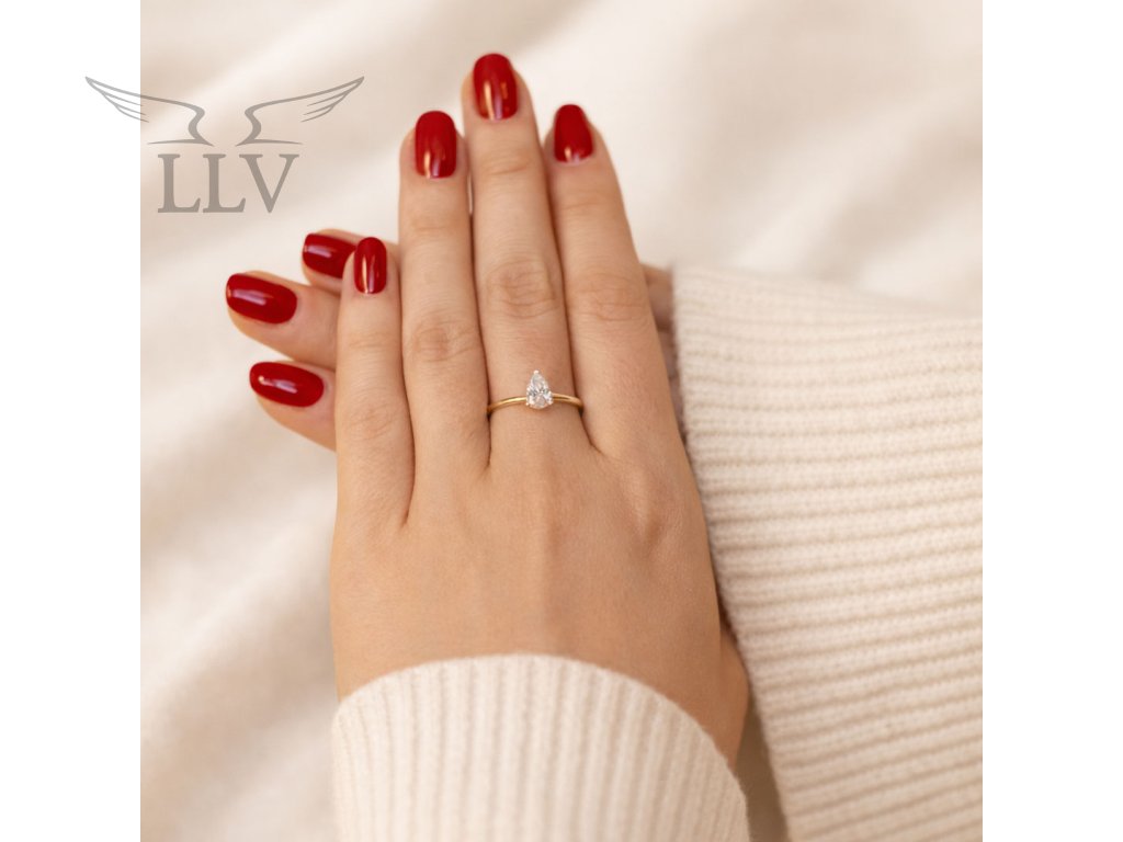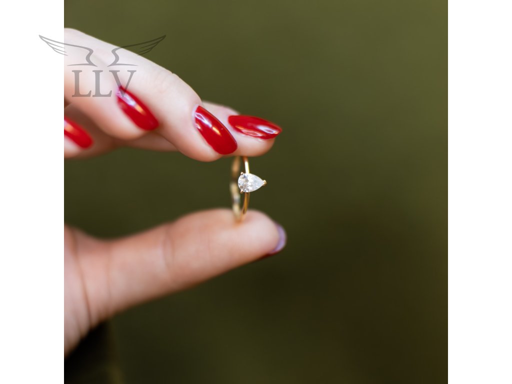 Prsteň zo 14 kt zlata zdobený zirkónom v tvare kvapky je šperkom, ktorý dokonale spája jemnosť a výraznú eleganciu. Dominantný kvapkovitý zirkón pôsobí ako drobná slza svetla a pri každom pohybe vytvára nádherný ligot.