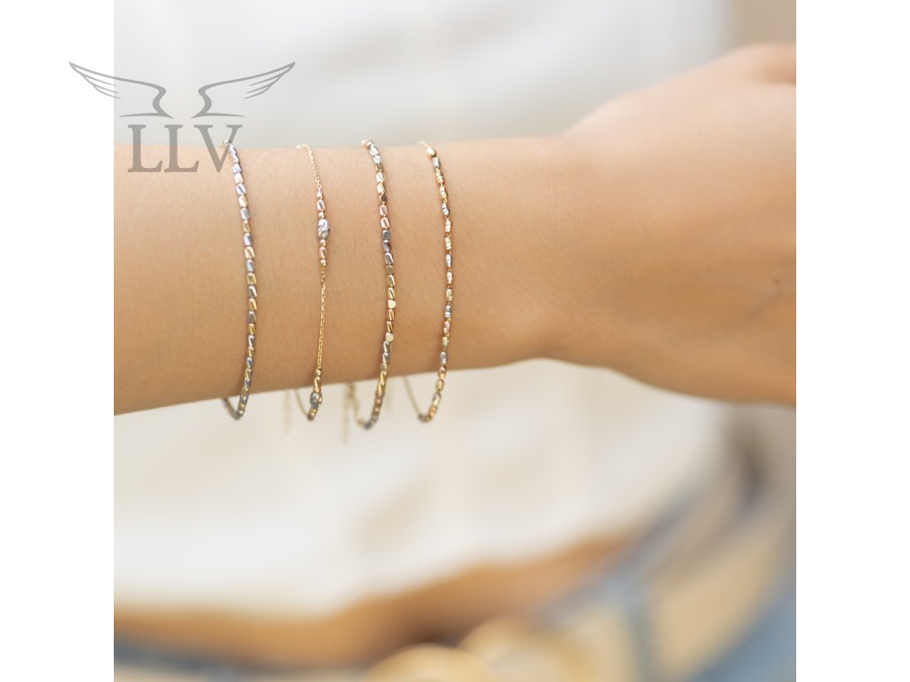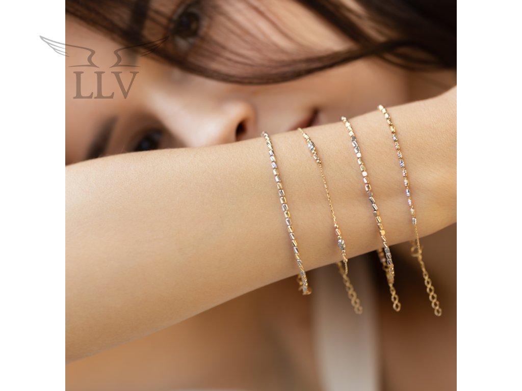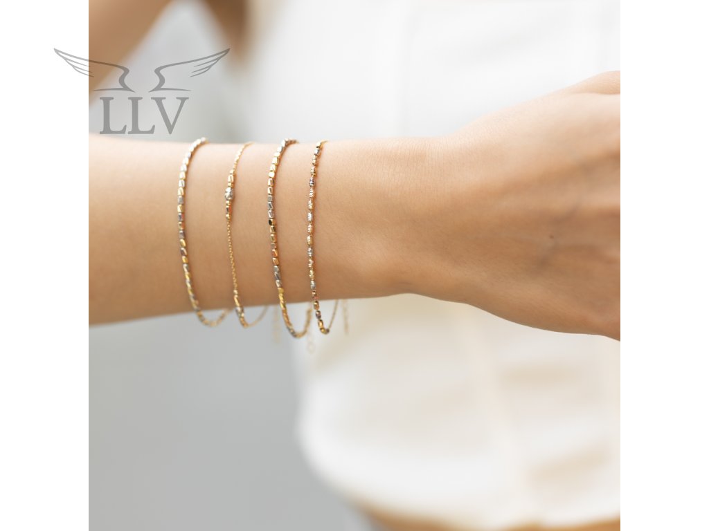 Doplňte svoj každodenný alebo večerný outfit elegantným jemným náramkom vyrobeným z kombinovaného 14kt zlata s lesklým povrchom! Nastaviteľná dĺžka umožní zapnúť šperk pomocou perového krúžku v rozmedzí od 17 do 19,5 cm. Samotný zlatý náramok sa skladá z jemnej retiazky vyrobenej zo žltého zlata, doplnenej gravírovanými valčekmi z bieleho zlata. Tie sú, z oboch strán, obklopené menšími valčekmi z ružového zlata a drobnými guličkami zo zlata žltého. Vďaka tomuto spojeniu tento dámsky náramok dokonale kombinuje tradíciu, romantiku aj moderný dizajn.