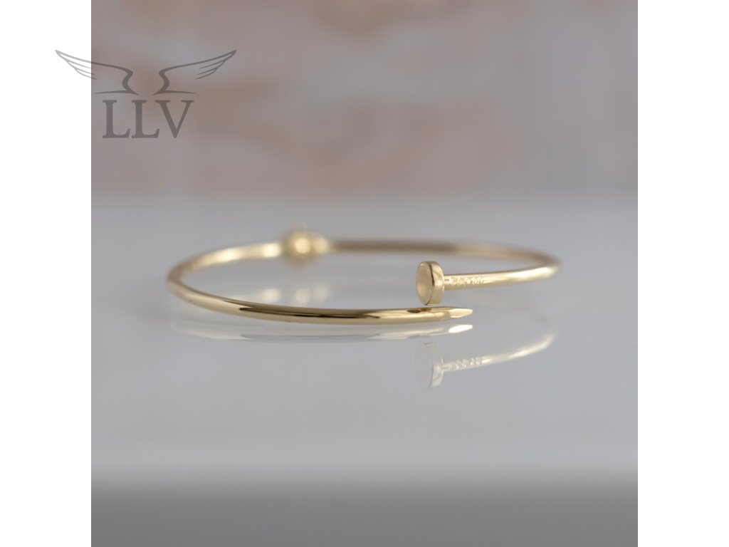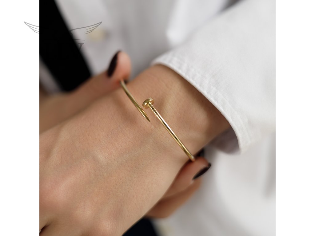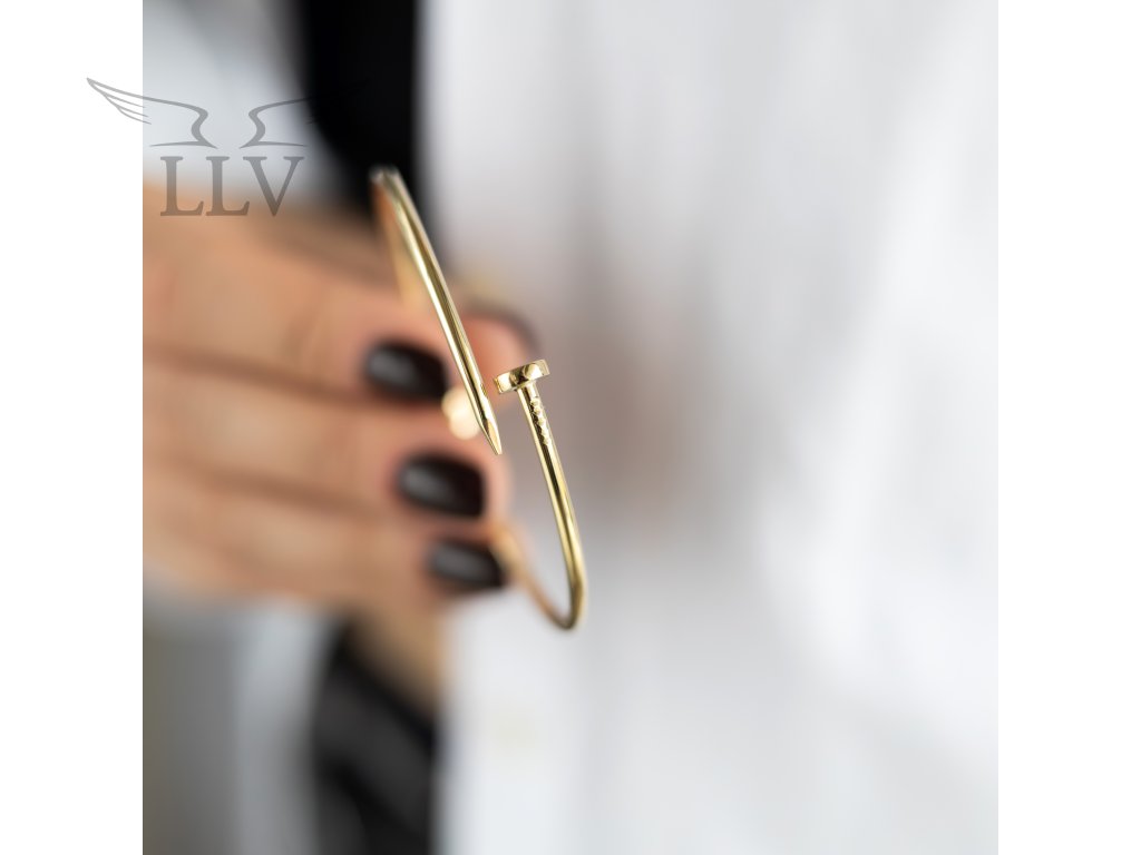 Zlatý náramok v tvare klinca je šperk, ktorý symbolizuje silu, odvahu aj originalitu. Perfektná voľba pre ženy, ktoré hľadajú moderný a sebavedomý doplnok, ktorý sa hodí ako na bežné denné nosenie, tak k výraznejším outfitom.