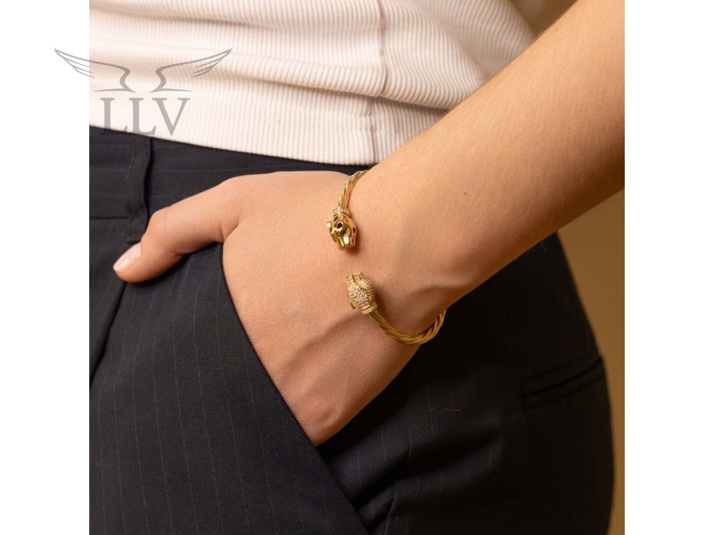 Jedna z hláv je celá osadená drobnými čírymi zirkónmi, ktoré vytvárajú neodolateľný lesk. Druhá hlava je zdobená čiernym smaltom, ktorý vytvára typické škvrny leoparda a dodáva šperku skutočne autentický vzhľad. Farebné zirkóny v očiach oboch hláv prepožičiavajú náramku dravý výraz.
