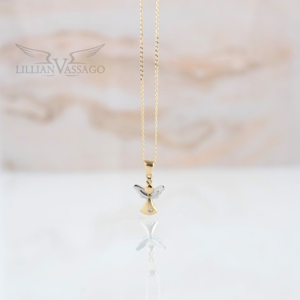 Drobný prívesok v tvare Anjelika, ktorý je tvorený z kombinovaného 14kt zlata a doplnený jedným trblietavým diamantom. Diamant je zapustený vo vnútri prívesku a povrch je hladký s lesklou povrchovou úpravou. Urobte radosť sebe alebo svojim blízkym týmto prekrásnym príveskom, ktorý Vás bude ochraňovať na každom kroku.