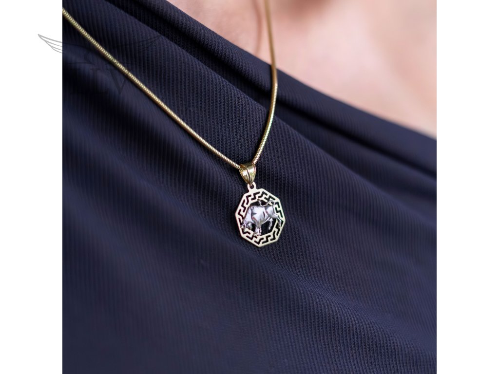Elegantný prívesok v znamení Býka z kombinovaného 14kt zlata očarí symbolickým významom a originálnym dizajnom. Tvarom pripomína jemný osemhran vyrobený zo žltého zlata, zdobený precízne brúseným dekorom v štýle gréckeho kľúča. Uprostred sa blýska plastický motív znamenia Býka v bielom zlate, ktorý krásne kontrastuje s rámom.