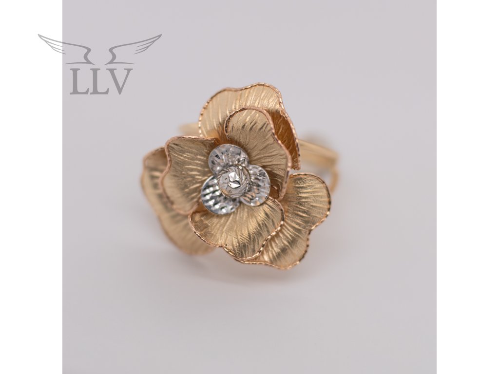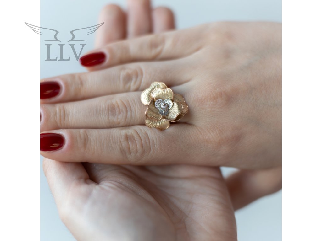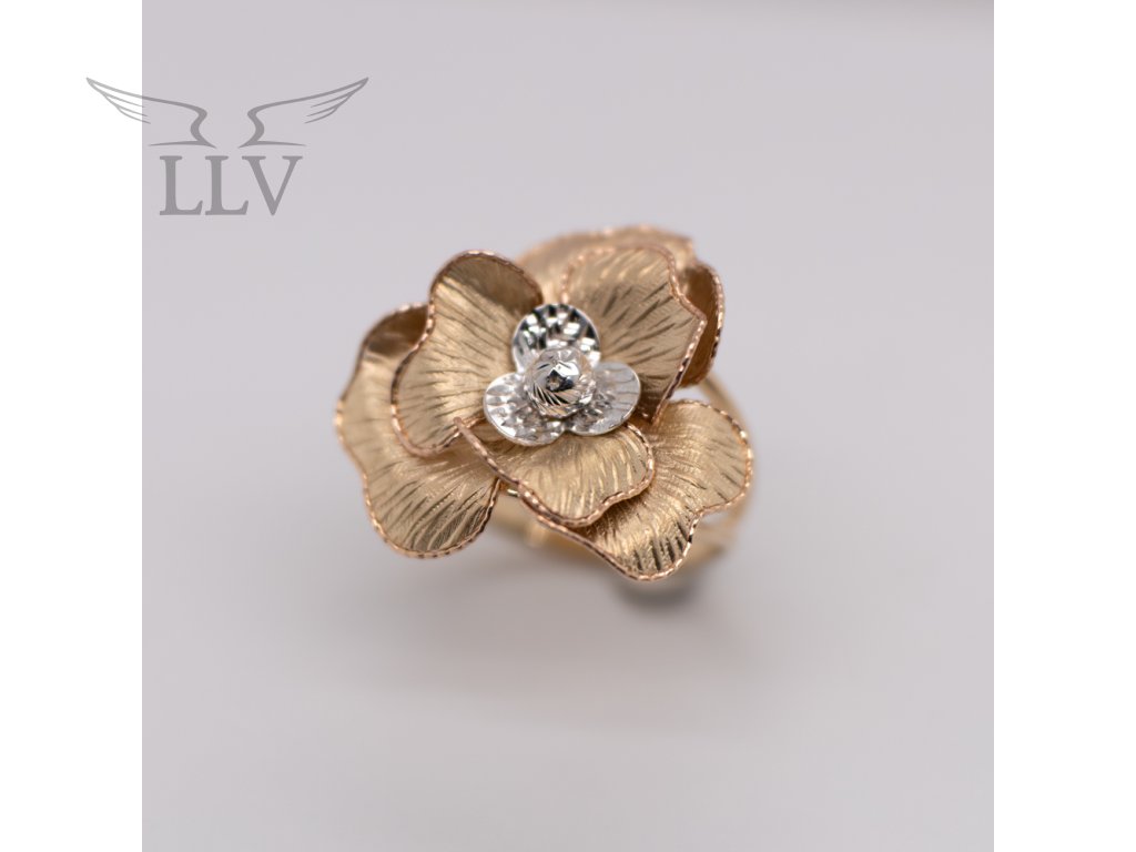 Stred kvetu tvorí drobná guľôčka a plátky z bieleho zlata s gravírovaním, ktoré prsteňu dodávajú jasný lesk a vytvárajú výrazný kontrast k teple tónovaným okvetným lístkom. Šperk je vyrobený zo 14-karátového zlata a navrhnutý tak, aby pohodlne sedel na ruke a súčasne vynikol ako samostatný výrazný prvok. Prsteň je ideálnou voľbou pre ženy, ktoré majú slabosť pre florálne motívy a zároveň hľadajú niečo výnimočné – šperk, ktorý upúta pozornosť bez toho, aby pôsobil prehnane.