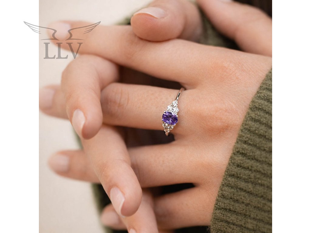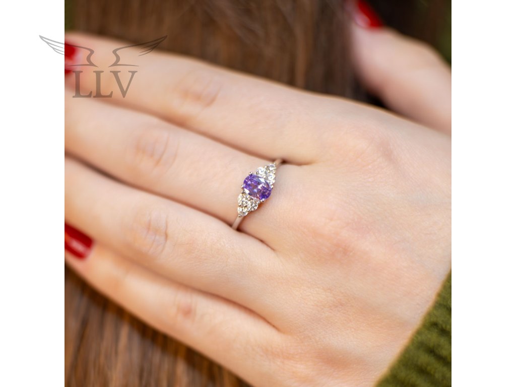 Prsteň so syntetickým ametystom a zirkónmi, biele zlato LLV66-GR128
