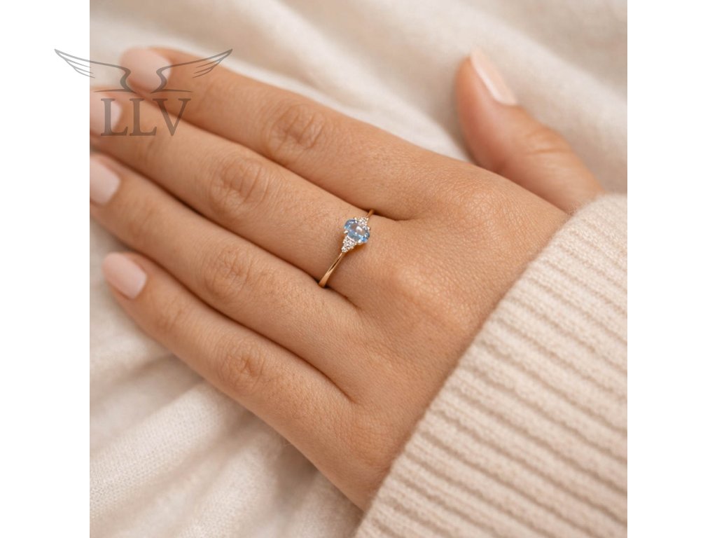 Zlatý prsteň zo 14kt zlata so syntetickým topazom a trblietavými zirkónmi je šperkom, ktorý zaujme svojou čistotou a jemným farebným efektom. Oválny topaz v ľadovo modrom odtieni pôsobí sviežo a elegantne, zatiaľ čo zirkóny po jeho stranách vytvárajú iskrivý rám, ktorý zvýrazňuje jeho jas a priezračnosť.