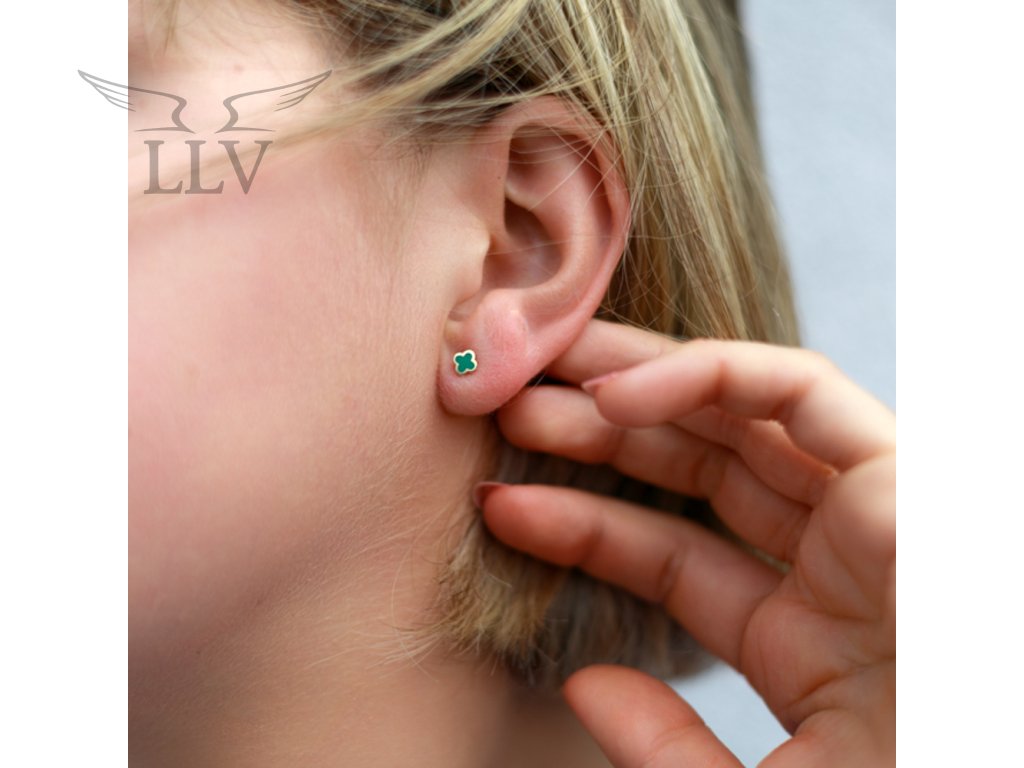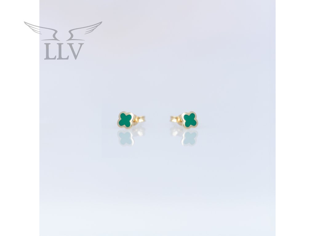 Zlaté napichovacie náušnice s štvorlístkom s zeleným smaltom LLV06-GER434Y