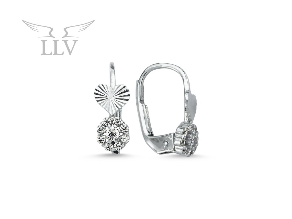 Nádherné detské náušnice z bieleho 14k zlata s klasickým zapínaním na patent. Povrch náušníc je hladký vo vysokom lesku s prekrásne gravírovaným srdcom. Trblietavé zirkóny sú zasadené do tvaru kytičky v guľatej obrube a uchytené v malých krapniach tzv. "zrnkách". Tieto roztomilé náušnice rozžiaria každú slečnu.