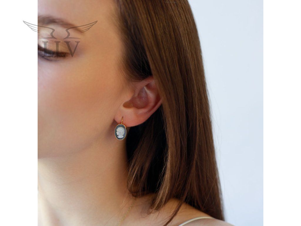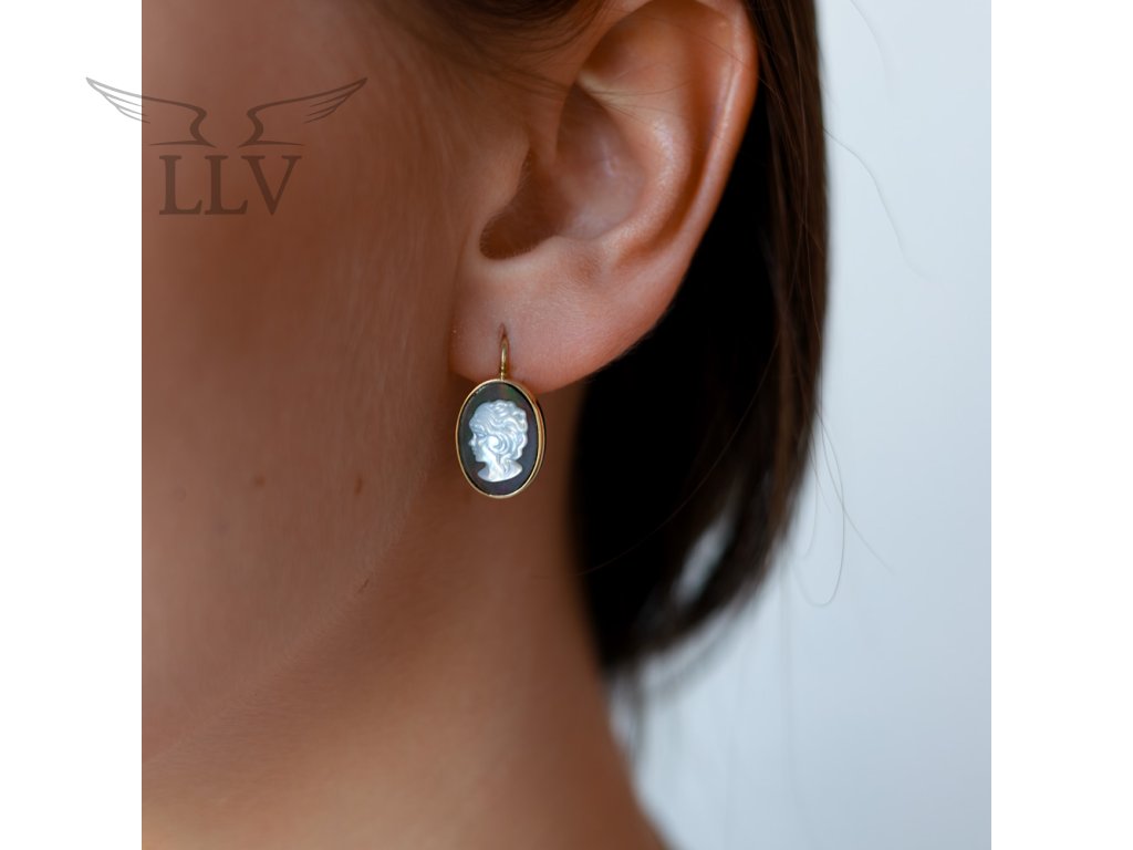 Zlaté náušnice s duchom antiky. Elegantné náušnice zo žltého 14kt zlata sú zdobené oválnou kamejou s jemne vyrezaným ženským profilom. Prírodný achát v tmavších tónoch vytvára pôsobivý kontrast s bielou siluetou a dodáva šperku nostalgický aj sofistikovaný charakter.