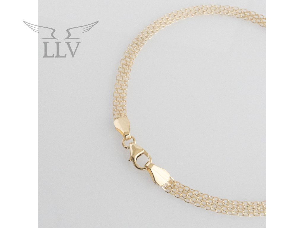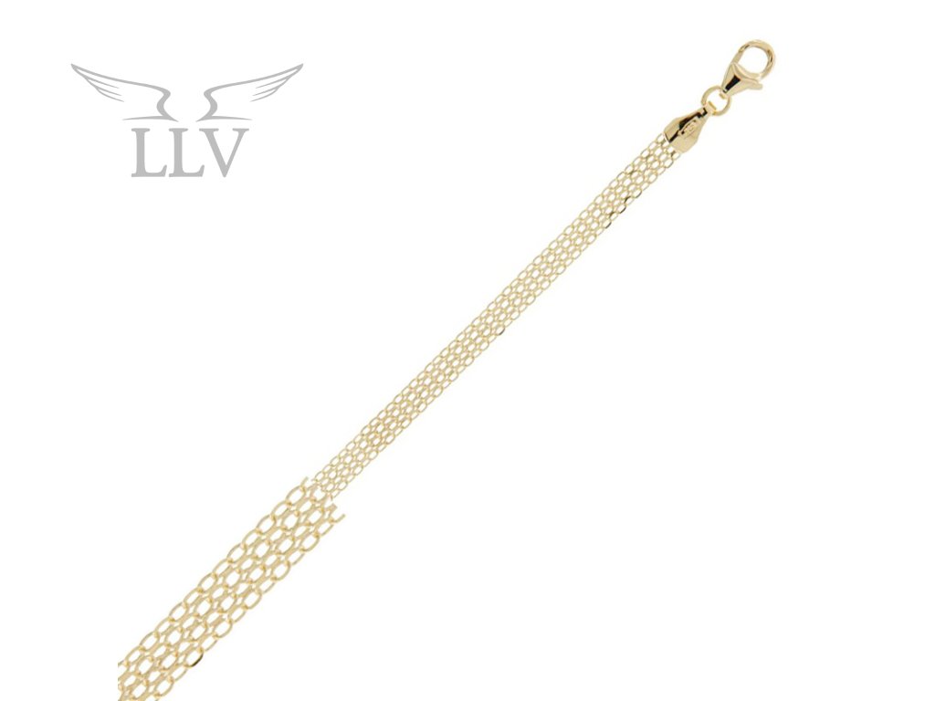 Zlatý náramok zo 14kt zlata zaujme svojim širokým, elegantne tkaným vzorom, ktorý pôsobí moderne a zároveň nadčasovo. Prepojenie niekoľkých jemných radov článkov vytvára efektnú štruktúru, ktorá krásne odráža svetlo a dodáva náramku výrazný lesk.