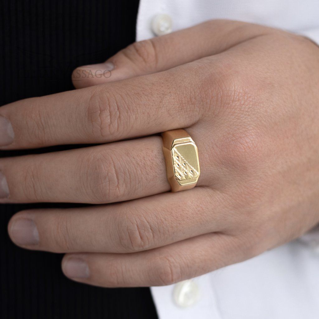 Exkluzívny prsteň zo žltého 14kt zlata je ideálnym šperkom pre tých, ktorí hľadajú výrazný šperk, ale zároveň preferujú čistý design s dôrazom na detail. Hlava prsteňa má obdĺžnikový tvar s elegantne skosenými hranami a je zdobená jemným gravírom, ktorý vytvára atraktívny diagonálny vzor doplnený motívom pripomínajúcim lístky. Hladká lesklá plocha v kombinácii s precízne vyrytým motívom dodáva prsteňu luxusný vzhľad a pôsobí moderne aj nadčasovo zároveň.