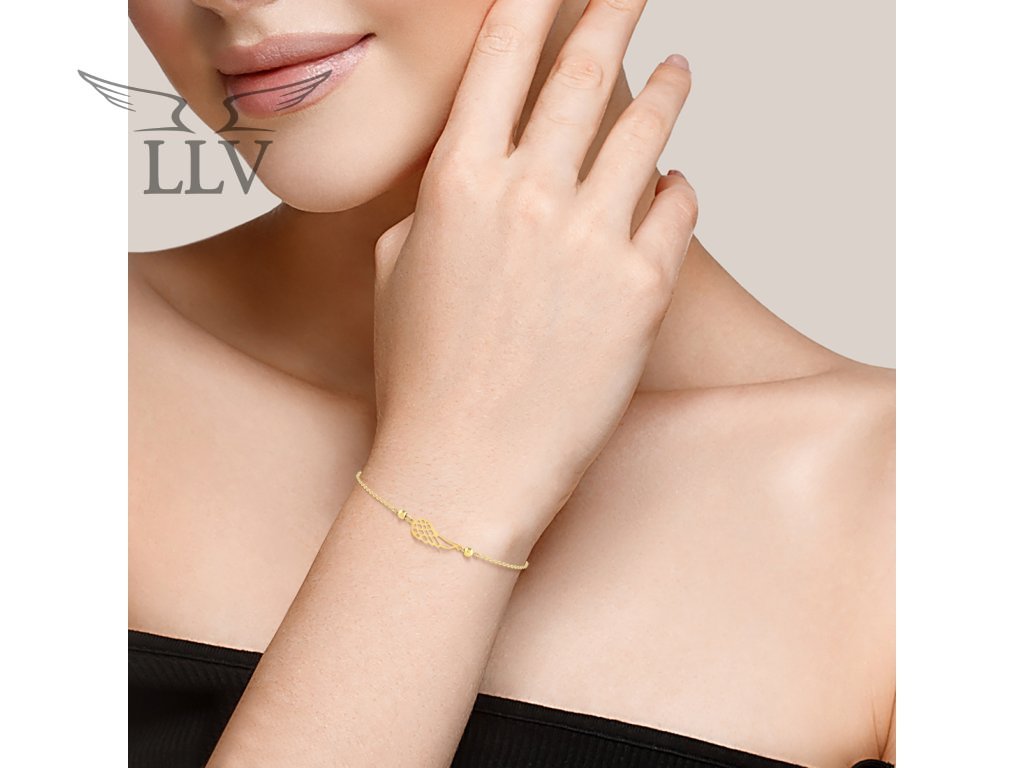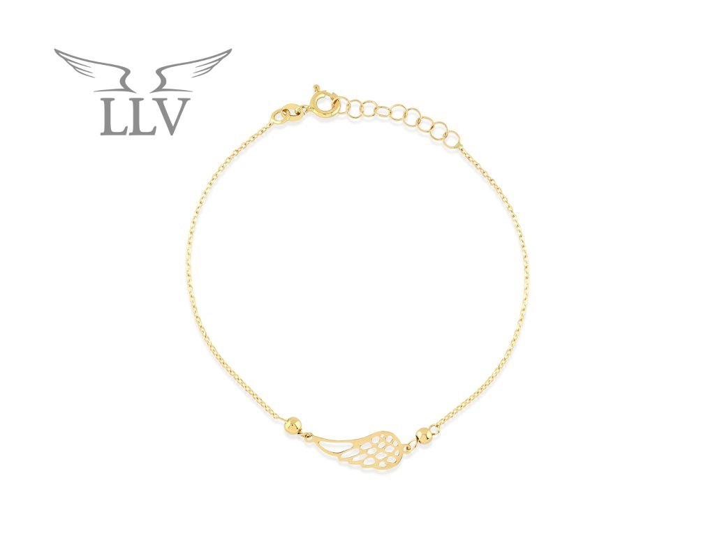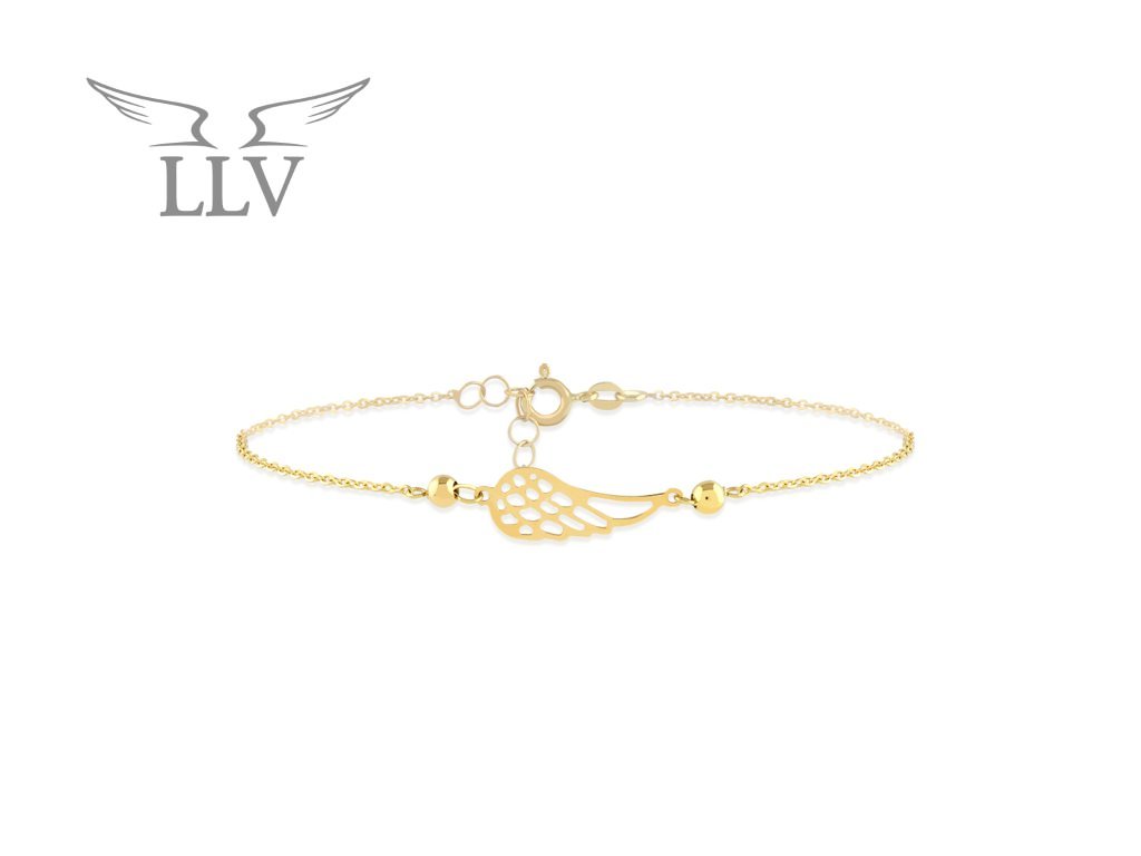 Náramok je zhotovený zo žltého 14kt zlata a je tvorený retiazkom typu rolo a napevno uchyteným príveskom v tvare anjelského krídla. Po stranách anjelského krídla sú uchytené dve dekoratívne guľôčky, ktoré sú zdobené jemným gravírom. Vďaka lesklej povrchovej úprave sa bude náramok dokonale vynímať na zápästí každej sebavedomej ženy. Náramok je dlhý 17 cm a vďaka klasickému zapínaniu na karabinku a očká ho možno o 2,5 cm predĺžiť. Pridajte k náramku náušnice alebo náhrdelník a získate tak prekrásnu sadu, s ktorou za žiarite pri každej príležitosti.