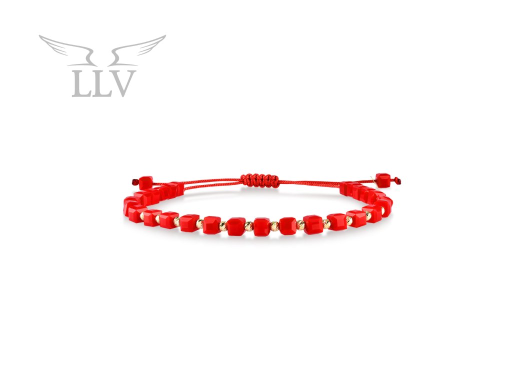 Moderný náramok s červenými krištáľmi doplnený guľôčkami zo žltého 14k zlata.