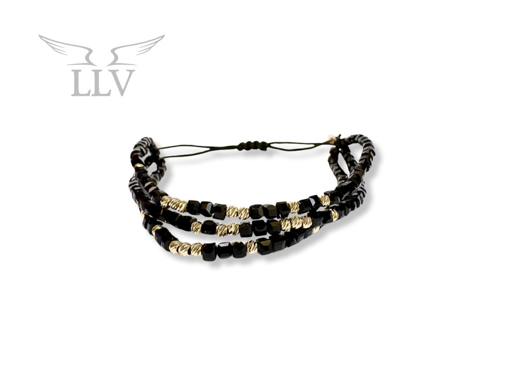 Úchvatný trojitý šnúrkový náramok s krištáľmi v nadčasovej čiernej farbe a zlatými guľôčkami.