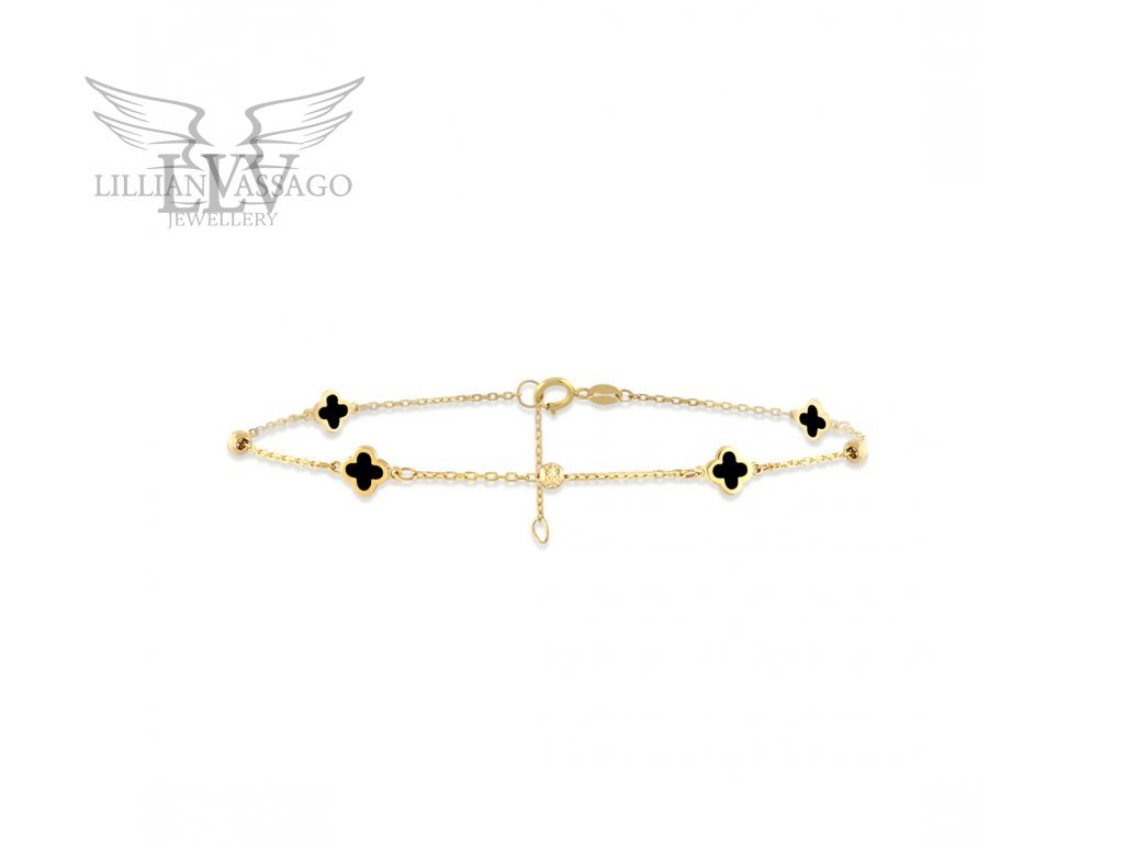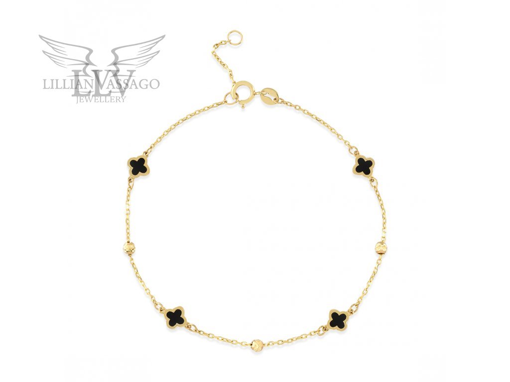 Zlatý náramok so štvorlístkami s čiernym smaltom a guličkami LLV06-GB142