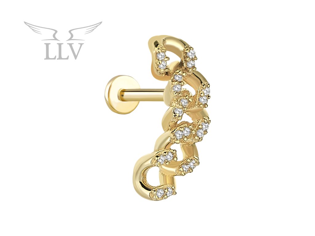 Zlatý piercing labreta so štruktúrou jemne prepletených článkov pripomína elegantný retiazkový motív, ktorý pôsobí sofistikovane a moderne zároveň. Každý oblúčik je precízne osadený drobnými žiarivými zirkónmi, ktoré sa pri pohybe jemne rozžiaria a dodávajú šperku iskrivú ľahkosť. Kombinácia lesklého žltého 14-karátového zlata a kamenného lesku vytvára vyvážený kontrast, ktorý zaujme na prvý pohľad.