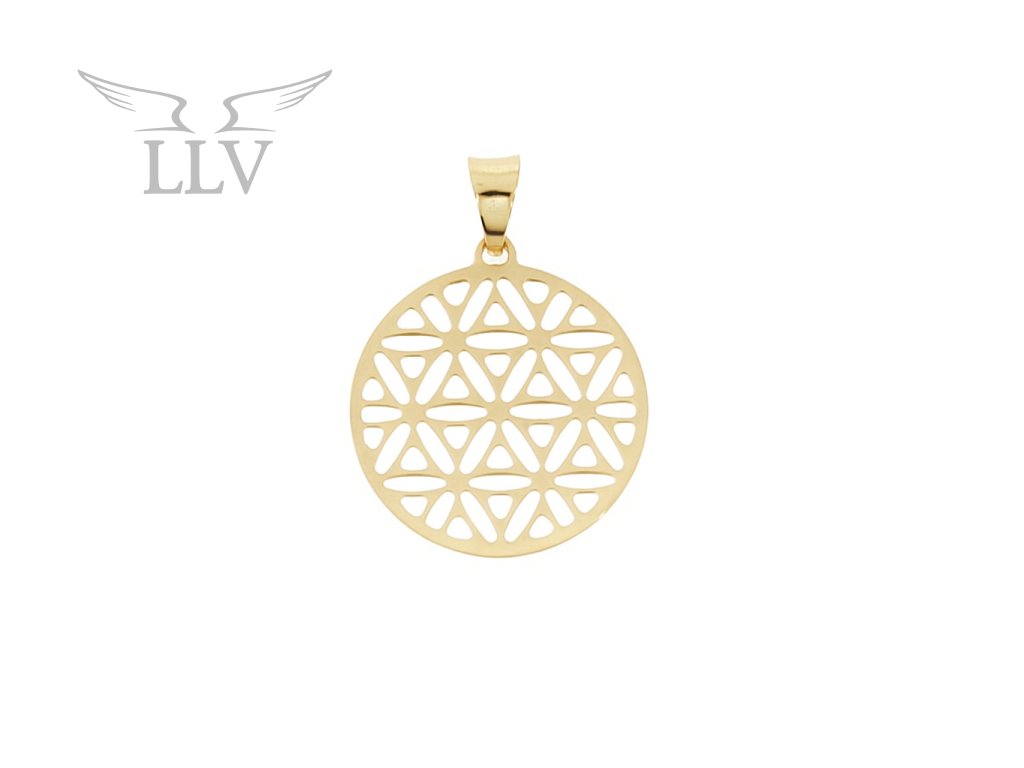 Symbol nehy a prírodnej krásy – to predstavuje jemný kruhový prívesok z lesklého 14kt žltého zlata s kvetinovým vzorom. Celý motív je tvorený vzdušnými líniami a výrezmi kvetov, ktoré po celej ploche prívesku vytvárajú ľahkú a elegantnú čipku z kovu.