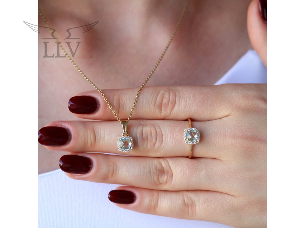 Nežnosť neba v každom detaile. Zlatý prívesok zo žltého 14kt zlata zdobí prírodný topás v jemnom odtieni sky blue, vybrúsený do elegantného štvorcového tvaru. Okolo hlavného kameňa žiaria číre zirkóny, ktoré zvýrazňujú jeho jemnú farbu a dodávajú šperku trblietavý rám.