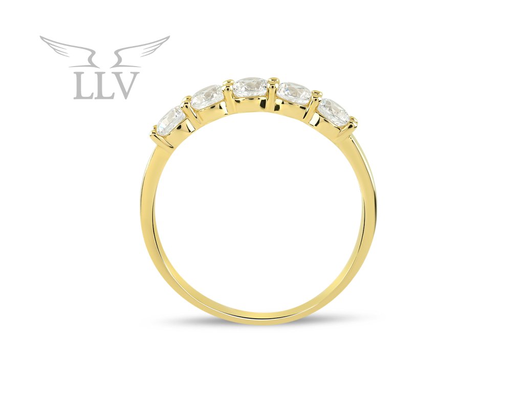 Prekrásny prsteň je vyrobený zo žltého 14kt zlata a je zdobený piatimi trblietavými zirkónmi, ktoré sú uchytené v krapňovom osadení. Povrch šperku je hladký v lesklej povrchovej úprave, vďaka ktorej je prstienok na ruke úplne neprehliadnuteľný. Vďaka klasickému designu sa Vám tento prstienok bude hodiť ku každodennému outfitu a aj k honosnej večernej róbe. Urobte radosť sebe alebo svojim blízkym týmto jedinečným šperkom, ktorý nikdy nevyjde z módy.
