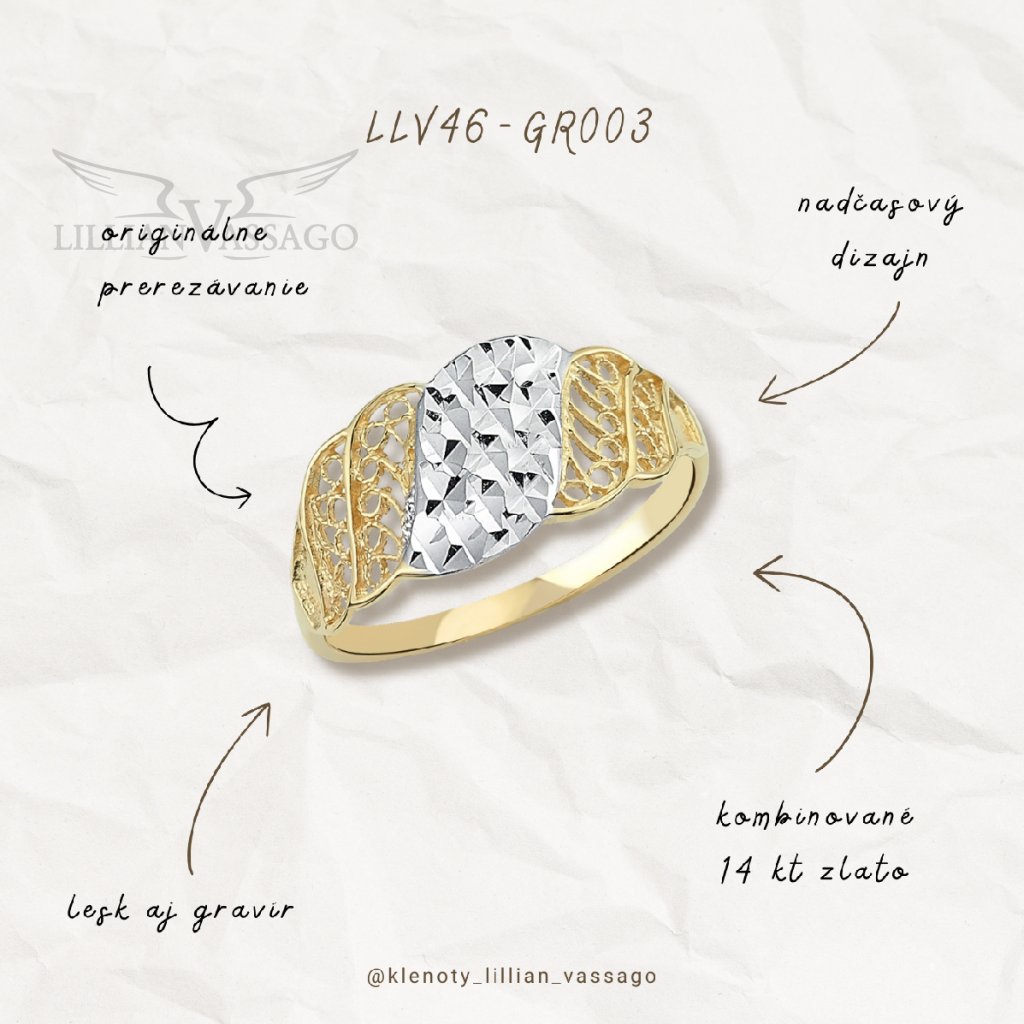 Nádherný celozlatý prsteň z kombinovaného 14kt zlata, zdobený jemným ornamentom. Stred prsteňa tvorí gravírovaný povrch z bieleho zlata, vďaka ktorému je celý šperk výraznejší a nádherne vynikne na ruke. Urobte si radosť, alebo svojim blízkym týmto dizajnovým šperkom.