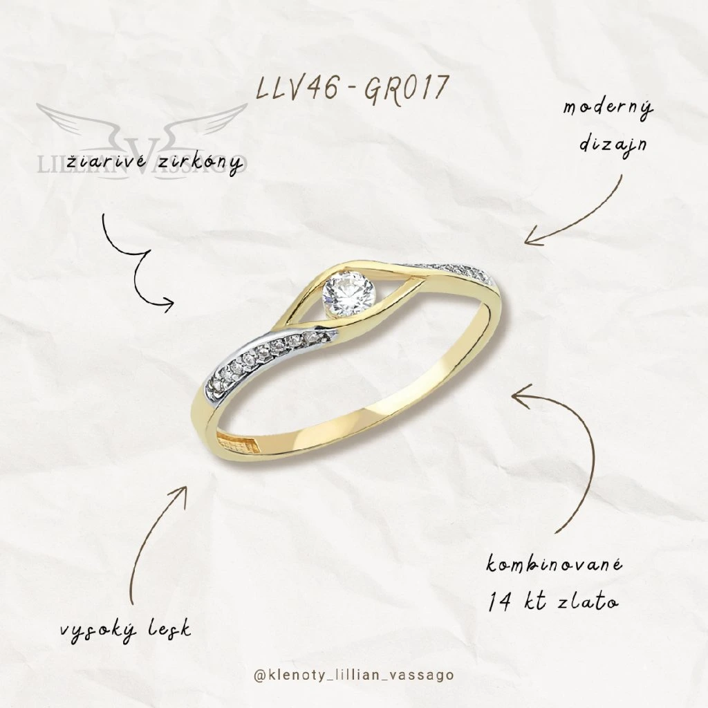 Moderný prsteň z kombinovaného 14kt zlata s jedným väčším zirkónom a niekoľkými menšími zirkónikmi, ktoré sú zasadené do obrúčky. Prsteň je hladký a lesklý v novodobom štýle, ktorý si iste zamilujete. Kamene sú upevnené pomocou krapní. Šperk je vhodný ako zásnubný prsteň alebo ako darček k výročiu, narodeninám, sviatku alebo čisto len tak pre radosť.