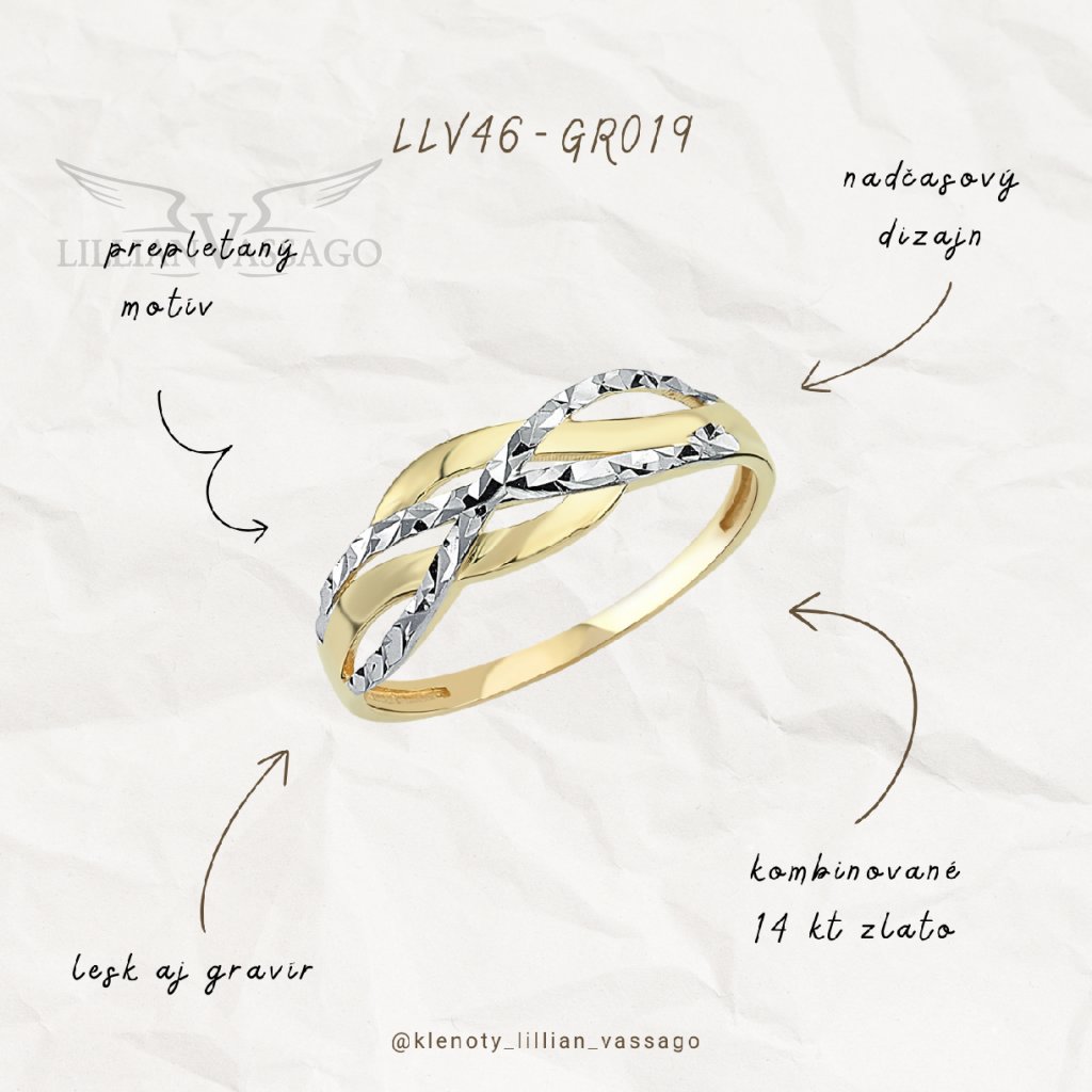 Nadčasový prsteň z kombinovaného 14kt zlata s elegantným prepleteným designom. Povrch je hladký s lesklou povrchovou úpravou a vďaka decentnému gravírovaniu nádherne vynikne na ruke. Šperk je vhodný na každodenné nosenie a určite urobí radosť každej žene i slečne.