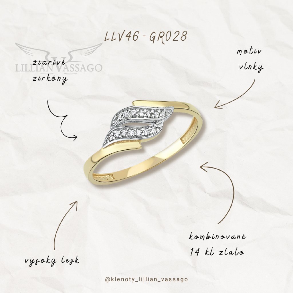 Pôvabný prsteň z kombinovaného 14kt zlata zdobený čírymi zirkónmi. Povrch prsteňa je hladký vo vysokom lesku a kamienky sú zasadené do bieleho zlata, ktoré ich krásne zvýrazní. Veľmi elegantný tvar, ktorý si isto zamilujete. Šperk je vhodný ako darček k výročiu, narodeninám, sviatku alebo jednoducho len tak pre radosť.