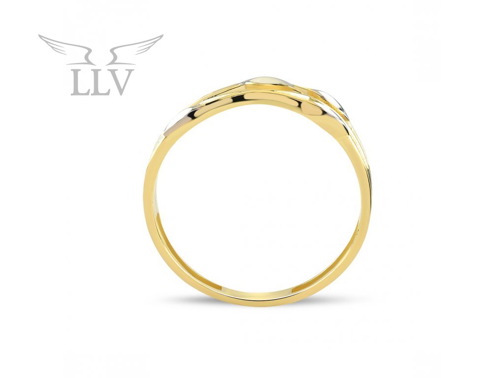 Moderný, precízne prepracovaný prsteň s motívom štyroch prepletených kriviek zo žltého 14kt zlata, osadených nežnými lístkami s decentným gravírovaním z bieleho 14kt zlata. Pútavosť prevedenia je zvýraznená lesklou a hladkou povrchovou úpravou, ktorá nechá vyniknúť lesk zlata. Vhodný pre všetky ženy aj slečny, pretože podčiarkne ich pôvab a ženskosť. Ako darček určite vykúzli prekrásny úsmev na tvári svojej budúcej nositeľke. Perfektný ako darček k výročiu alebo len tak pre radosť. Svoju nositeľku môže zdobiť pri širokom spektre príležitostí.