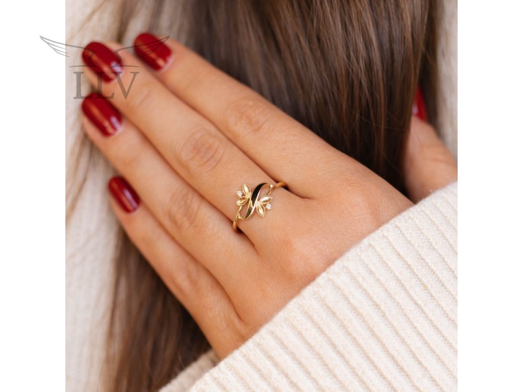 Zlatý prsteň s motívom listov so smaltom a zirkónmi LLVG-GR003