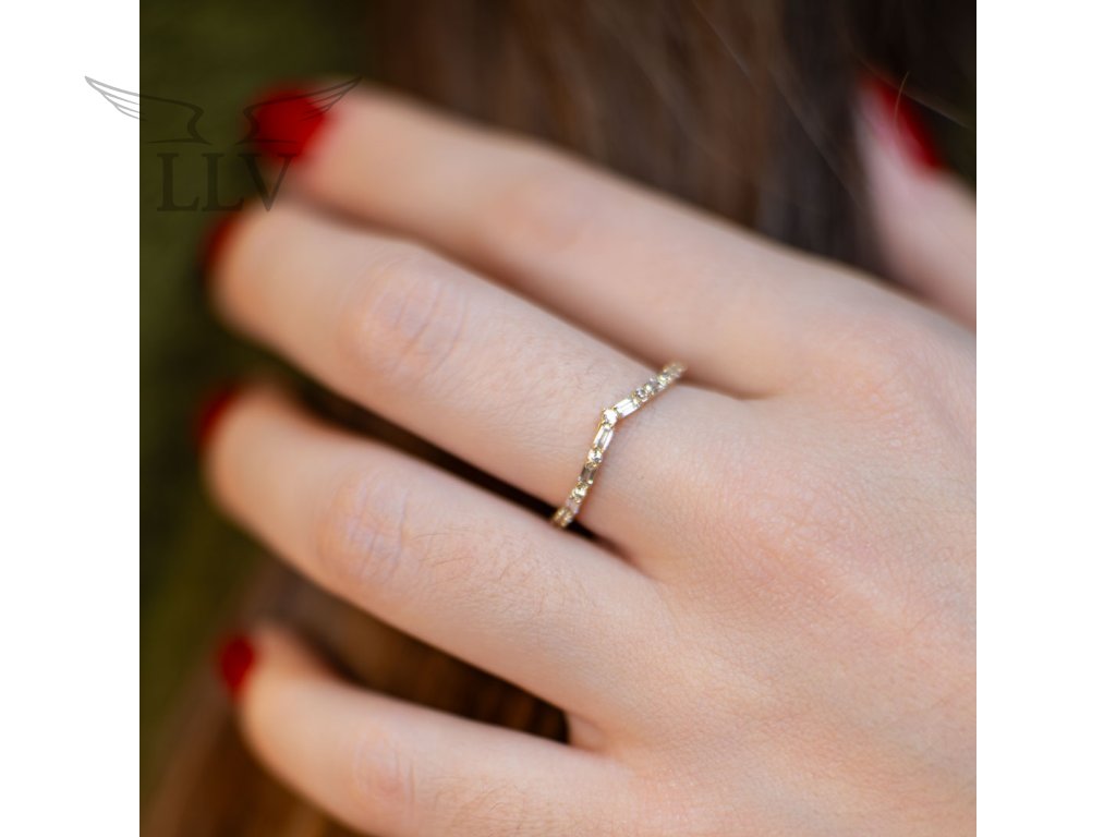 Prsteň zo 14 kt zlata zdobený žiarivými zirkónmi je elegantným a výrazným šperkom, ktorý okamžite upúta svojím neobvyklým tvarovým prevedením. Jemné zúženie do elegantného tvaru „V“ krásne predlžuje prsty a dodáva ruke ladnosť, zatiaľ čo línia trblietavých zirkónov podčiarkuje výnimočný dizajn celého kúsku.